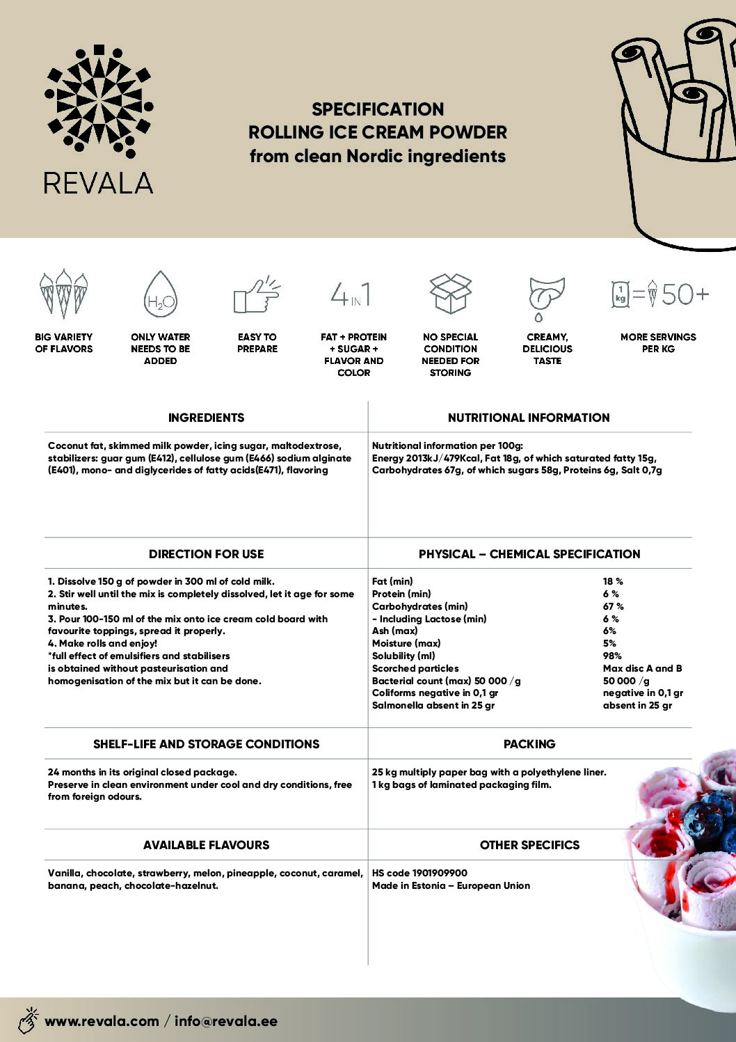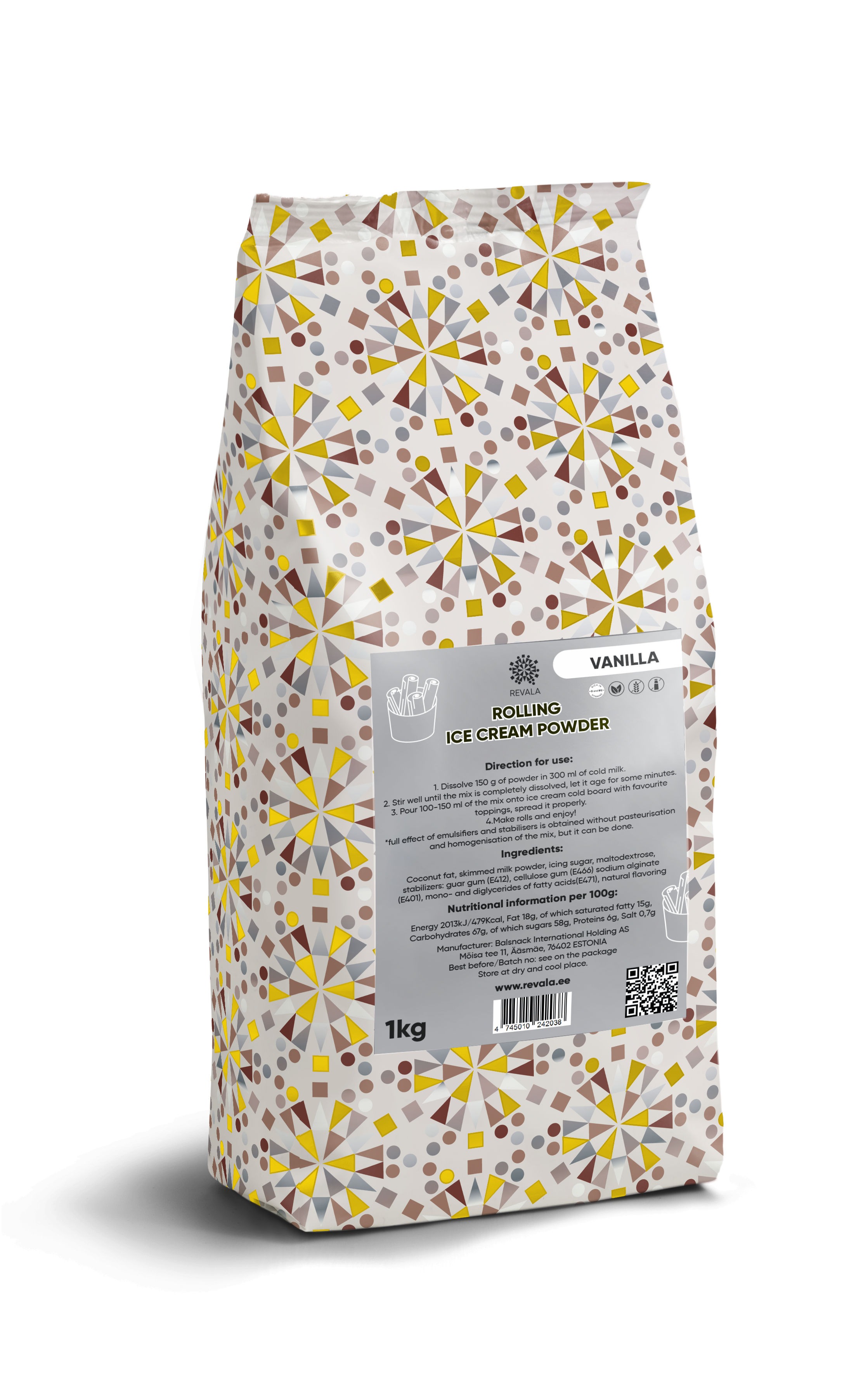 Rulli jäätisepulber on saadaval 1 kg ja 25 kg pakendites. Suurema koguse tellimiseks palun pöördu otse Revala meeskonna poole!